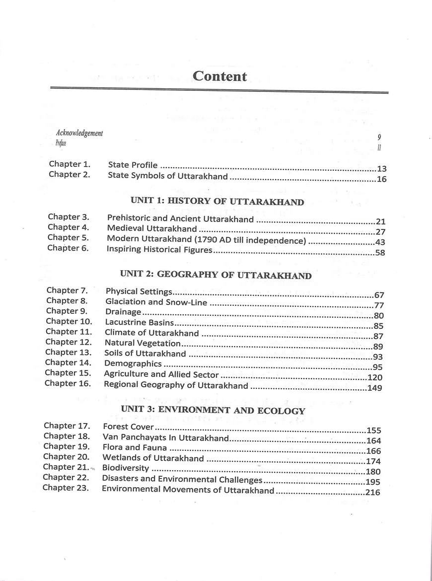 The content is divided into well-organised units. The initial chapters introduce the state profile and state symbols, followed by a detailed historical analysis ranging from prehistoric and ancient Uttarakhand to medieval and modern periods. Important historical personalities and movements are also discussed in a clear and exam-oriented manner.