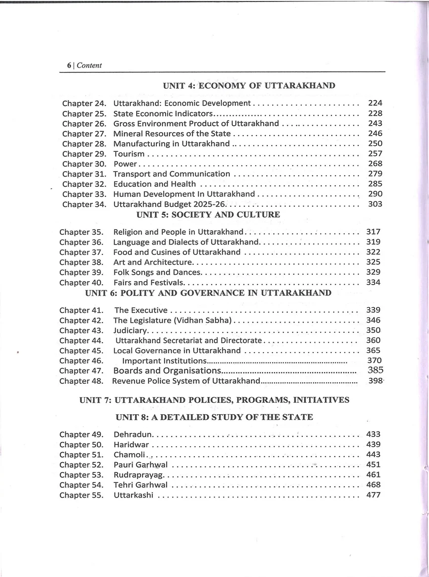 A major highlight of the book is its extensive section on the Economy of Uttarakhand, covering economic development, state indicators, Gross Environment Product (GEP), mineral resources, industries, tourism, power, transport, education, health, and human development. The inclusion of the Uttarakhand Budget 2025–26 adds strong contemporary relevance.
