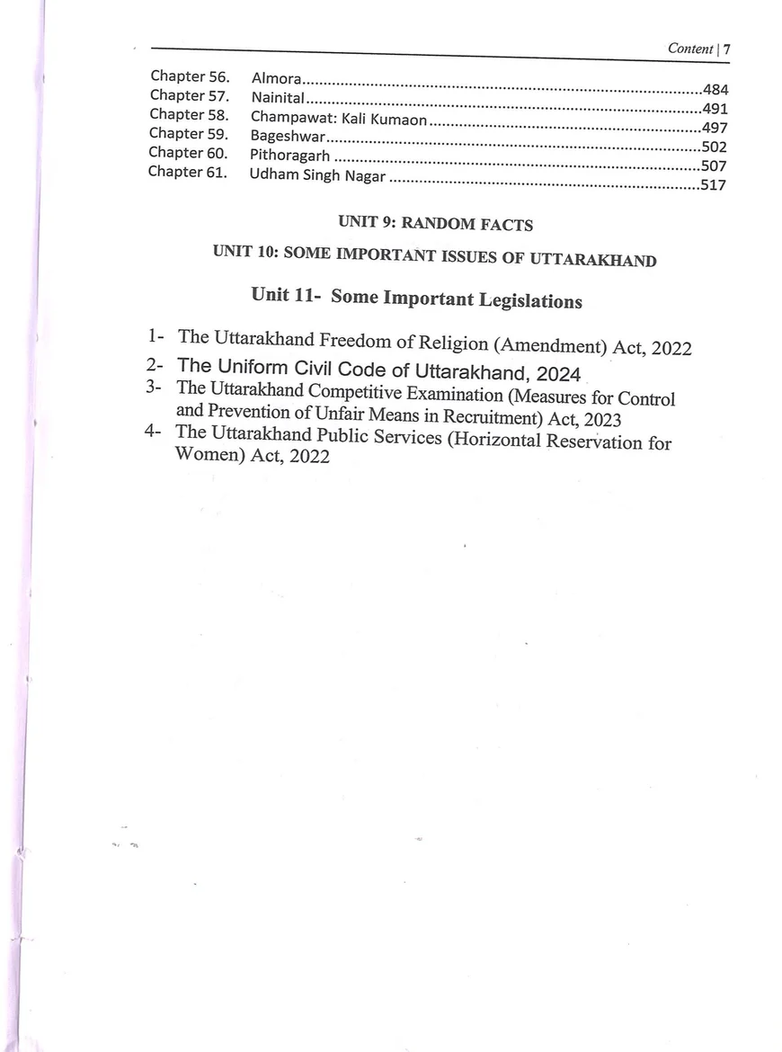 Another standout feature is the district-wise detailed study of all 13 districts of Uttarakhand, including history, geography, culture, tourist places, and key facts. Additional units on Random Facts, Important Issues, and Recent Legislations such as the Uniform Civil Code of Uttarakhand (2024) make this edition highly updated.
