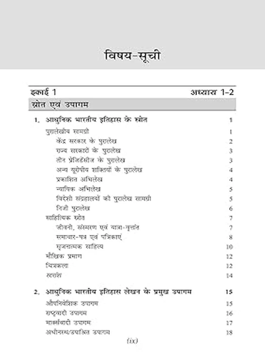 This book offers a comprehensive coverage of Modern Indian History, beginning with sources of modern history and major historiographical approaches. It explains the advent of Europeans, expansion of British power, administrative policies, economic exploitation, and resistance movements in a systematic manner. The freedom struggle is explained phase-wise, covering the role of leaders, organizations, revolts, constitutional developments, and mass movements. Special focus is given to socio-religious reform movements, press and education, tribal resistance, and revolutionary activities. The content is aligned with the latest UPSC and State PCS syllabus and reflects repeated exam trends.