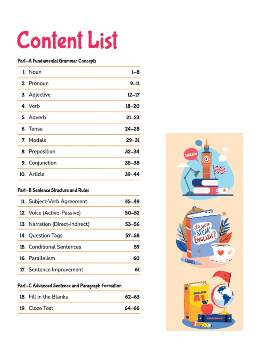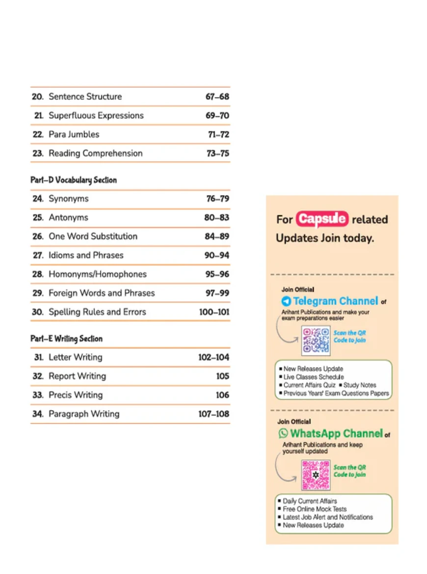 The main strength of this book lies in its capsule-style handwritten notes, where complex English grammar and usage rules are simplified into short points, examples, tables, and illustrations. Instead of long theoretical explanations, the book focuses on exam-relevant rules and frequently asked concepts, helping aspirants save time while improving accuracy.