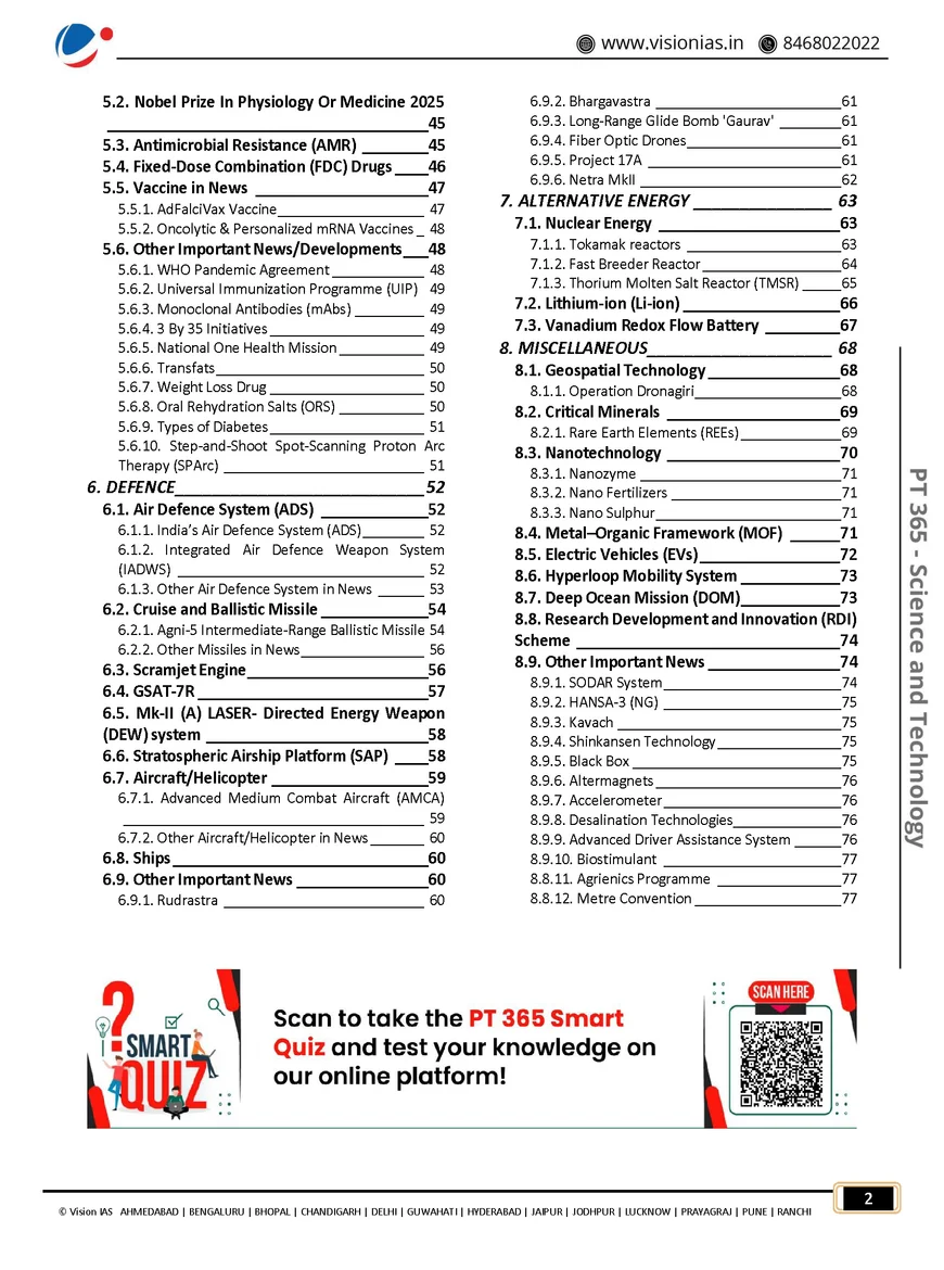 This PT 365 Science and Technology volume systematically covers major domains such as Biotechnology, Artificial Intelligence, Quantum Technology, Space Technology, Health & Medicine, Defence Systems, Energy, Nanotechnology, Climate-linked innovations, and Emerging Technologies. Each topic is presented with background concepts, recent developments, and relevance for UPSC Prelims. Special emphasis is placed on issues frequently asked in objective examinations, including missions, technologies in news, scientific terms, and government initiatives. The material also integrates NCERT corner explanations to ensure conceptual clarity for beginners as well as revision-friendly content for advanced aspirants.