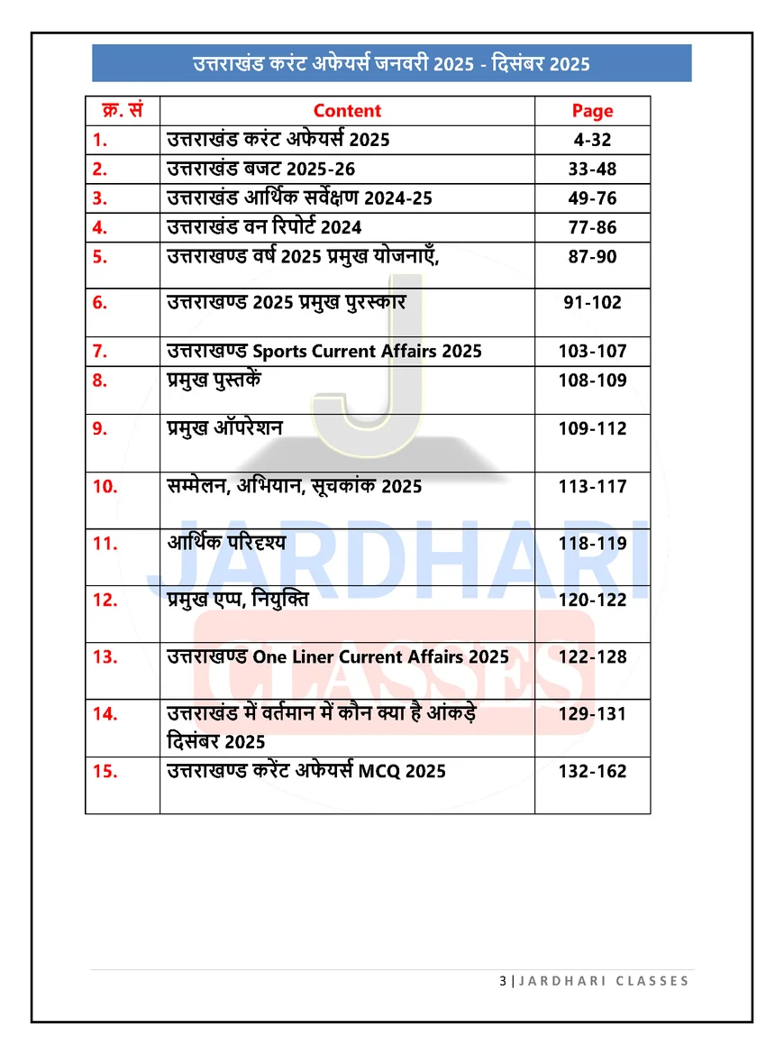 Uttarakhand Current Affairs Yearly 2025 (January–December) is a comprehensive and exam-focused e-book specially prepared for candidates appearing in UKPSC, UKSSSC, Patwari, Police, Group-C, Lecturer, and other Uttarakhand state competitive examinations. This book provides complete coverage of all important events, government decisions, reports, schemes, and developments related to Uttarakhand during the year 2025.